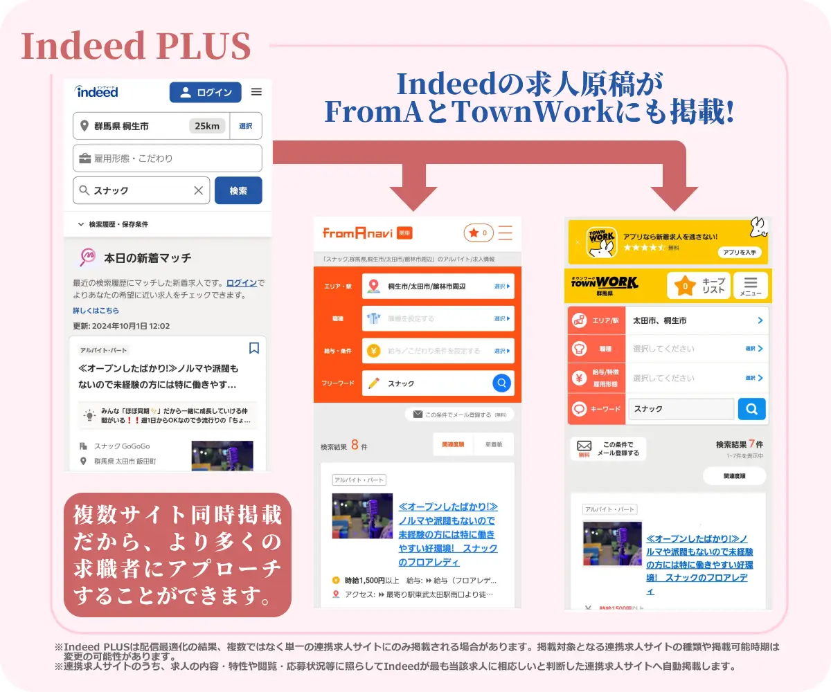 Indeedに有料掲載することで、その求人原稿が FromA と TownWork に同時掲載される新しいサービスです。求職者と求人のより効率的なマッチングを実現します。